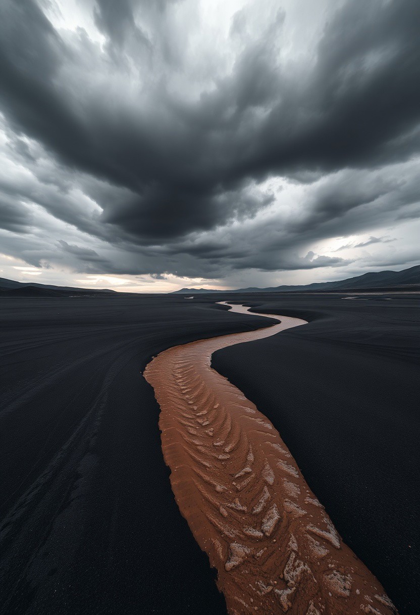 render of a black sand desert with a large brown river running through it, a dark grey stormy sky in the background, a low camera angle, and high contrast, dramatic clouds