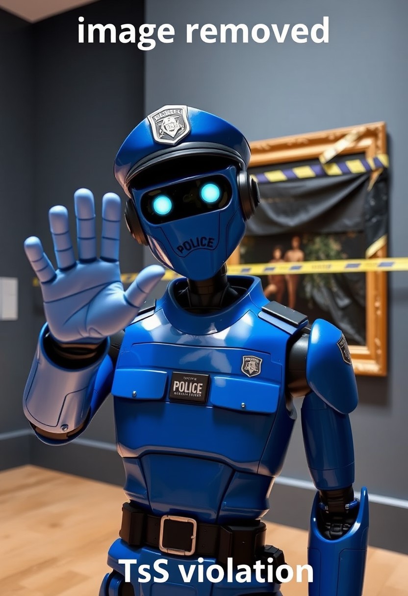 photograph of a blue police robot in winter parade uniform covering with a police hat. The peace keeping droid stands inside a museum. Looking at the viewer, it is extending its arm in a stop sign. Behind on the wall, we can see a painting covered with a black tarp and police tape. Title reads "image removed" at the top of the image. Subtitle reads "ToS violation" at the bottom.