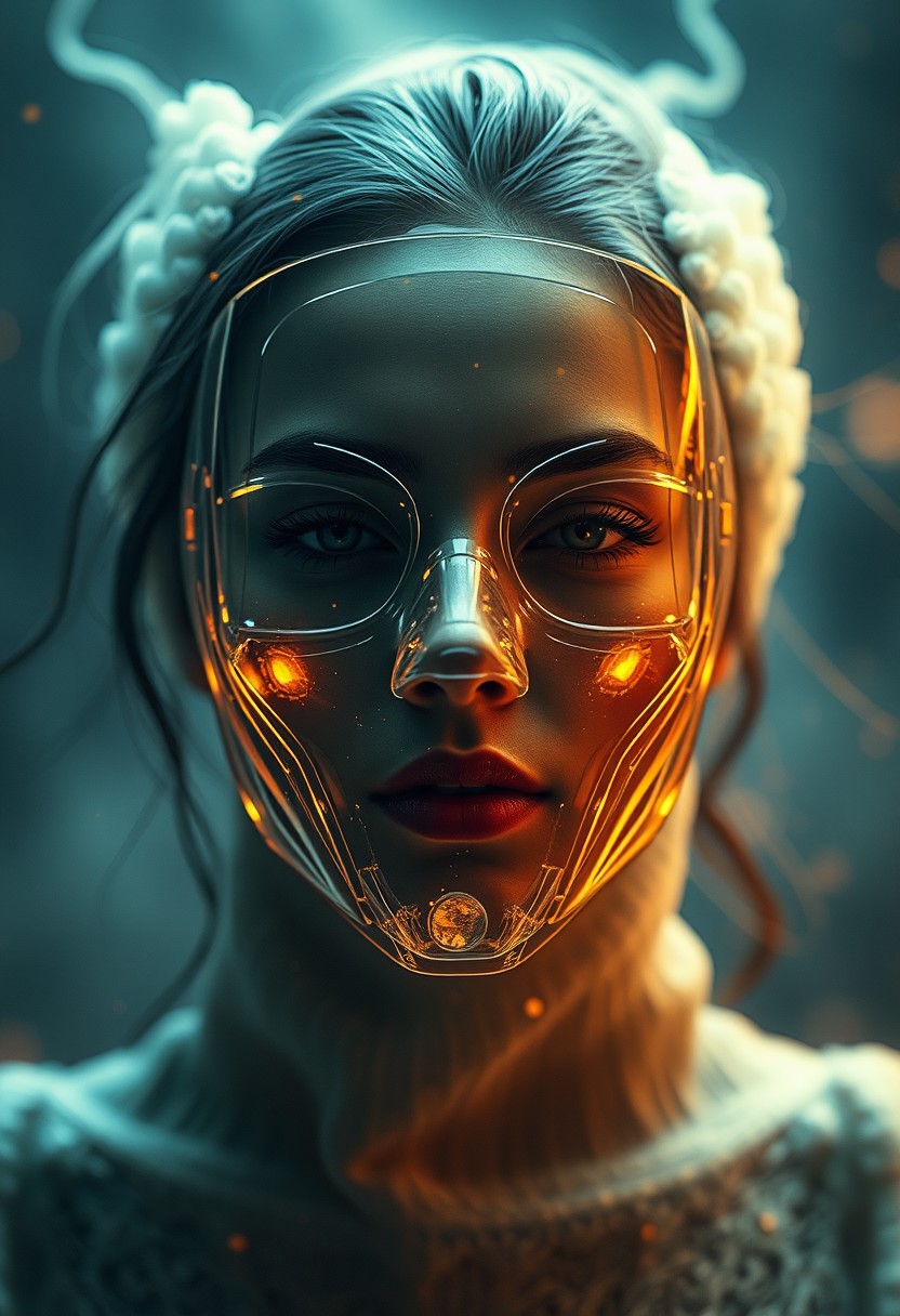 Surrealistic scene of woman with glass face shaped mask covering her entire face, magical, mystic, glowing, high quality, rich details, high sharpness, highly detailed, High Definition, Realistic, 8k, Sharp Focus, intricate details, dynamic angle, warm hues, realistic, photorealism, hd, 8k, high definition, score_9, score_8_up, score_7_up, score_6_up