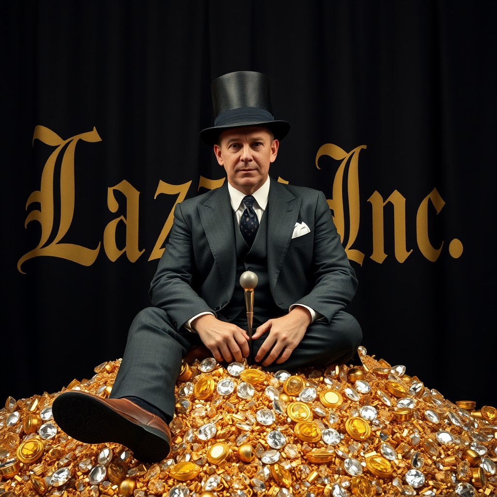 a huge classic businessman from the early 20s sits on a pile of diamonds and gold, he is dressed in a classic three-piece suit with a top hat, in the background there is a black curtain with writing in classic big roman font "Lazy Inc"