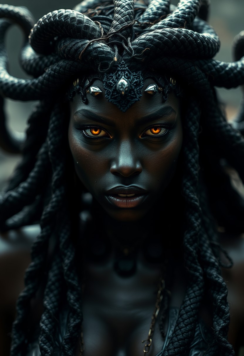 Modern, 2020s, detailed cinematic shot from, realistic cinematic scene, dark brown black woman portrays Medusa, the gorgon woman with writhing snake hair, full lips glowing yellow eyes, no pupils, Intricate, Sharp focus, Highly detailed, Fantasy, Dark lighting, ominous mood., realistic Medusa high saturation, Bright, Vibrant, full of action, Very stylish, far shot, full body, showing detailed intricate work, shot in the style of wes anderson and stephen king, oscar winning photography, striking image captures, meticulous attention, stunning costume design