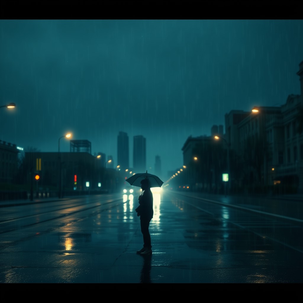 A dimly lit, rainy street at night, with soft streetlights casting a faint glow. In the foreground, a person stands alone under an umbrella, their figure slightly blurred, symbolizing fading memories. The city behind them is empty and distant, with reflections of lights on the wet pavement. The sky is cloudy, with faint stars barely visible, adding a sense of loneliness and melancholy. A soft, fading spark in the background symbolizes the lost hope and emotions fading away. The overall color palette should be cool tones, with shades of blue, gray, and a touch of warm amber from the streetlights.
