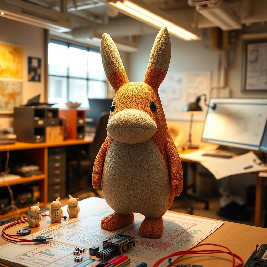 moomin, artistic, masterpiece, design space, office, electronics, circuit, eight moomins, very detailed, abstract objects, well organized space, warm lighting, vibrant colors, blueprint, discussion, design plans, technical drawings, positive vibe,