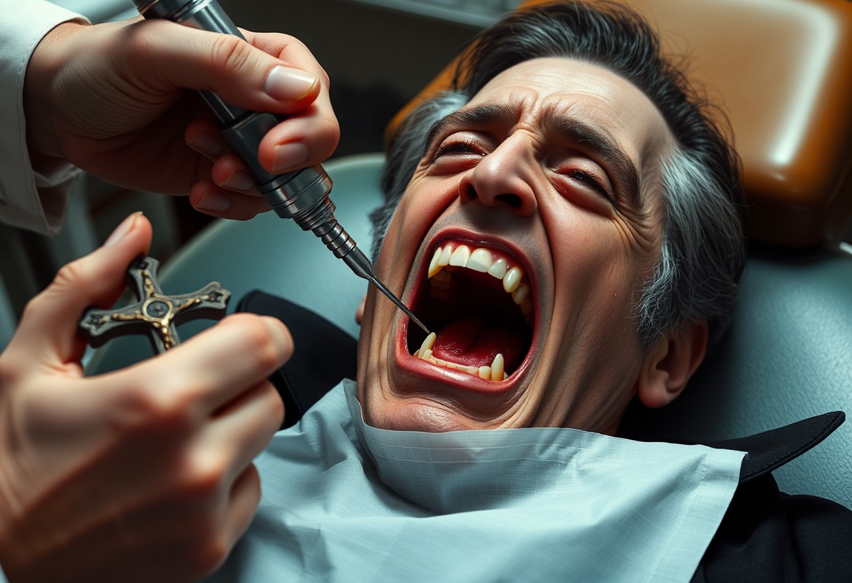 count dracula version christopher Lee, nervous and sweating lying in a dentist chair with his mouth open while a drill cleans cavities from one of his pointy teeth. Another hand holds a crucifix to keep Dracula still.