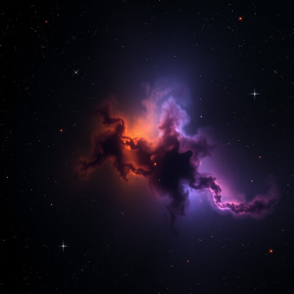 photorealistic dark translucent cosmic nebula in hues of black, blue, orange, and purple, and with 6 diffraction lines on stars