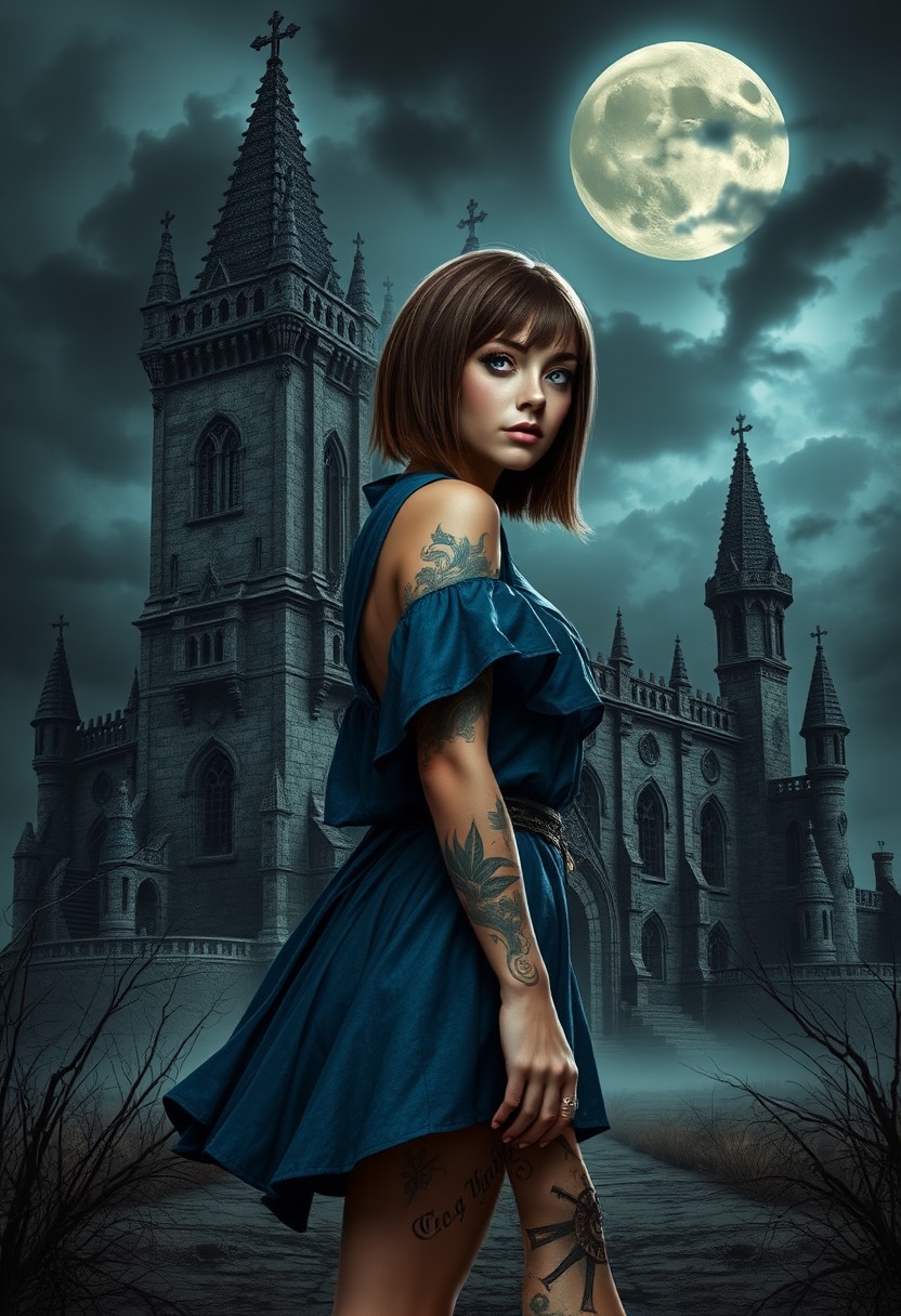 Digital fantasy artwork depicting a woman with fair skin and short, straight, brown hair, she has blue eyes and is wearing heavy makeup, including dark eyeshadow, eyeliner, and pink blush, wearing a short blue tunic revealing mystical tattoos on her arms and legs. She is walking away from a towering, intricately designed gothic castle is set against a dark, stormy sky with a full moon. The castle has a weathered, ancient appearance, giving it a mystical and eerie ambiance. The structure is surrounded by a barren, desolate landscape. The overall mood is dark