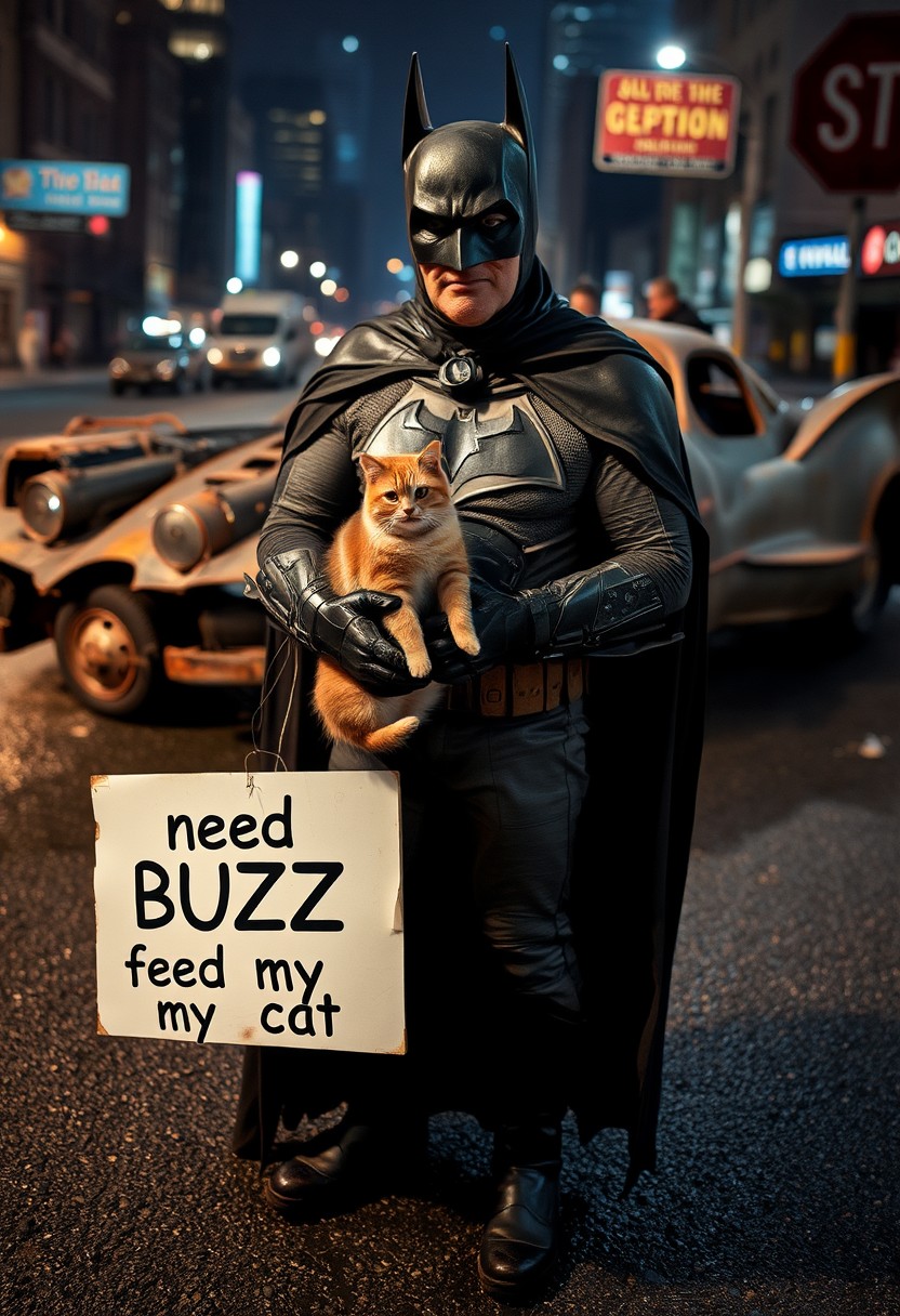 Closeup of old 77 year old Batman in worn out batman bodysuit and ripped worn cape standing and holding chubby cat in front of his rusted and worn Batmobile holding sign "need BUZZ to feed my cat", night, wet asphalt, Gotham city in background