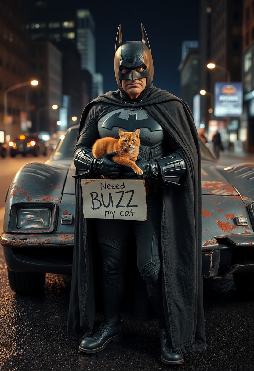 Closeup of old 77 year old Batman in worn out batman bodysuit and ripped worn cape standing and holding chubby cat in front of his rusted and worn Batmobile holding sign "need BUZZ to feed my cat", night, wet asphalt, Gotham city in background