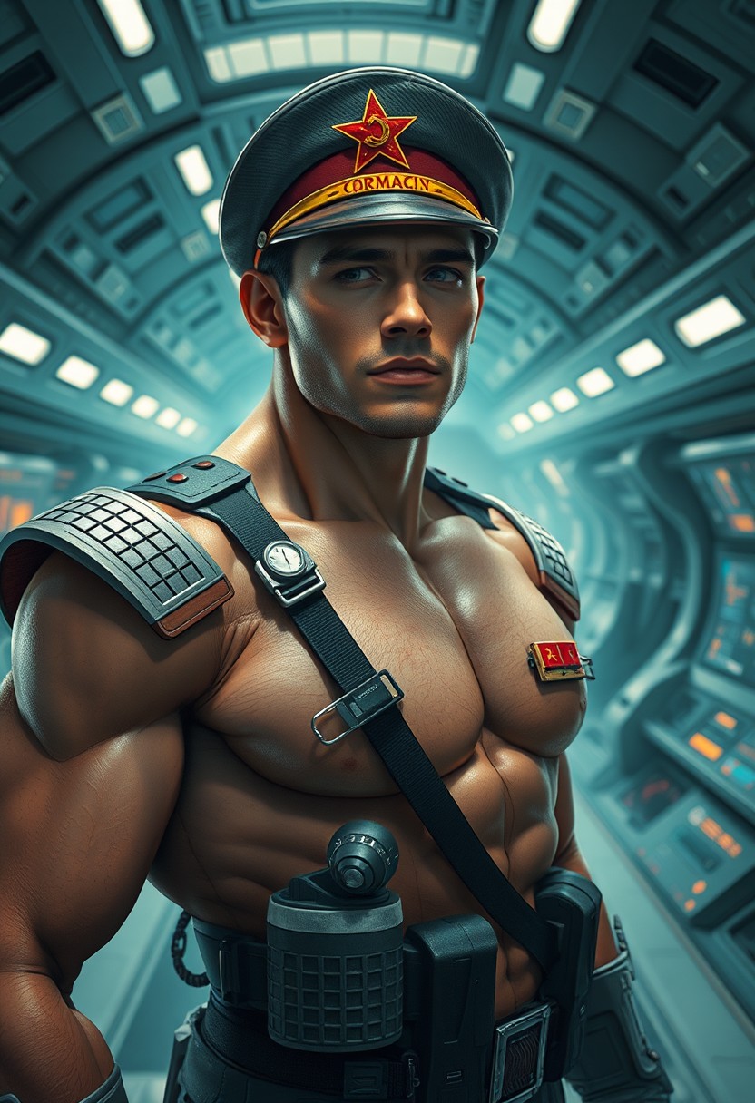 retro futurism style, communist commander, space command, wide angle, detailed environment, muscular, handsome, detailed background, lifelike, highly detailed, intricate, detailed face, natural colors, professionally color graded, photorealism, 8k, crisp lighting, trending on tumblr, art by artgerm and greg rutkowski and alphonse mucha and loish and WLOP , Mysterious