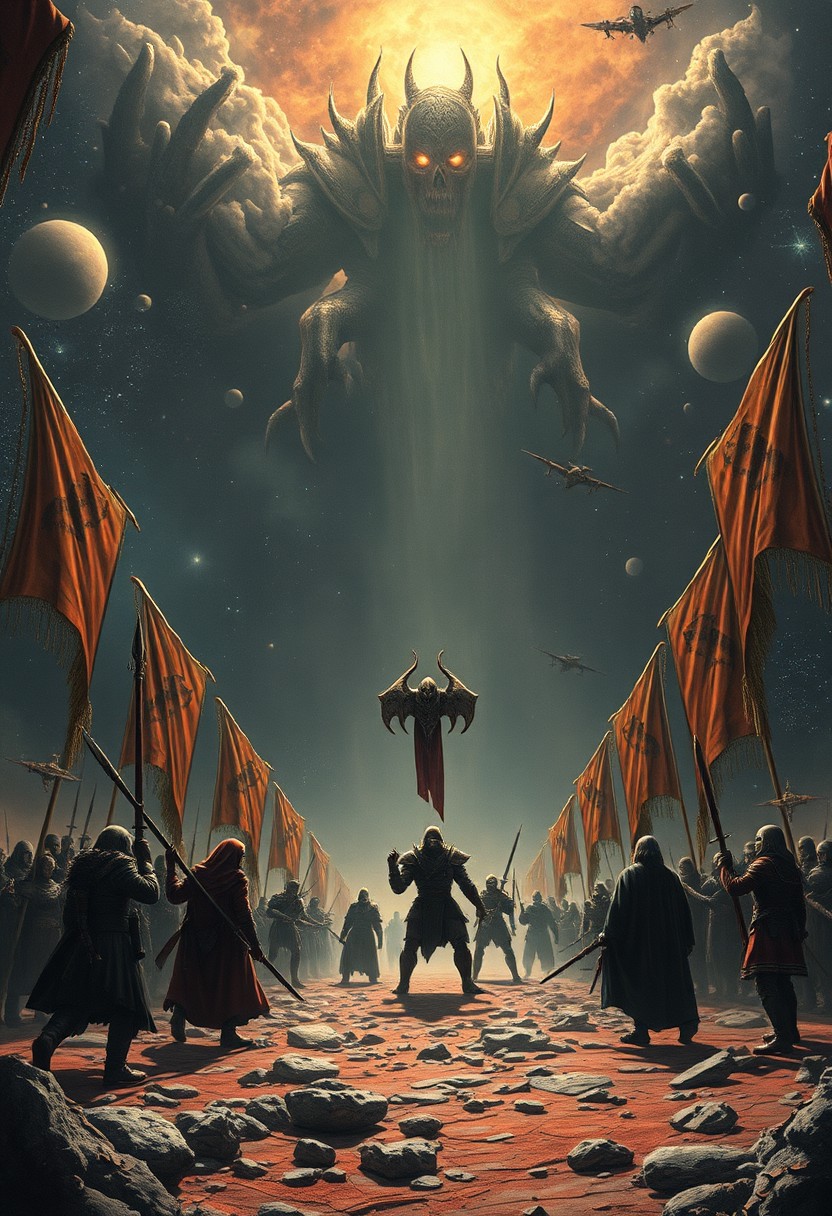 lovecraftian horror, At the edge of our galaxy, a grand assembly of cosmic warriors converges upon a dark nebula, to confront a malevolent extraterrestrial force looming ominously in the background a colossal entity poised to wreak havoc across the stars, As they ready themselves for battle, each fighter stands tall amidst their respective planetary banners, their weapons glinting under distant suns, style of Edward Blair Wilkins . eldritch, cosmic horror, unknown, mysterious, surreal, highly detailed
