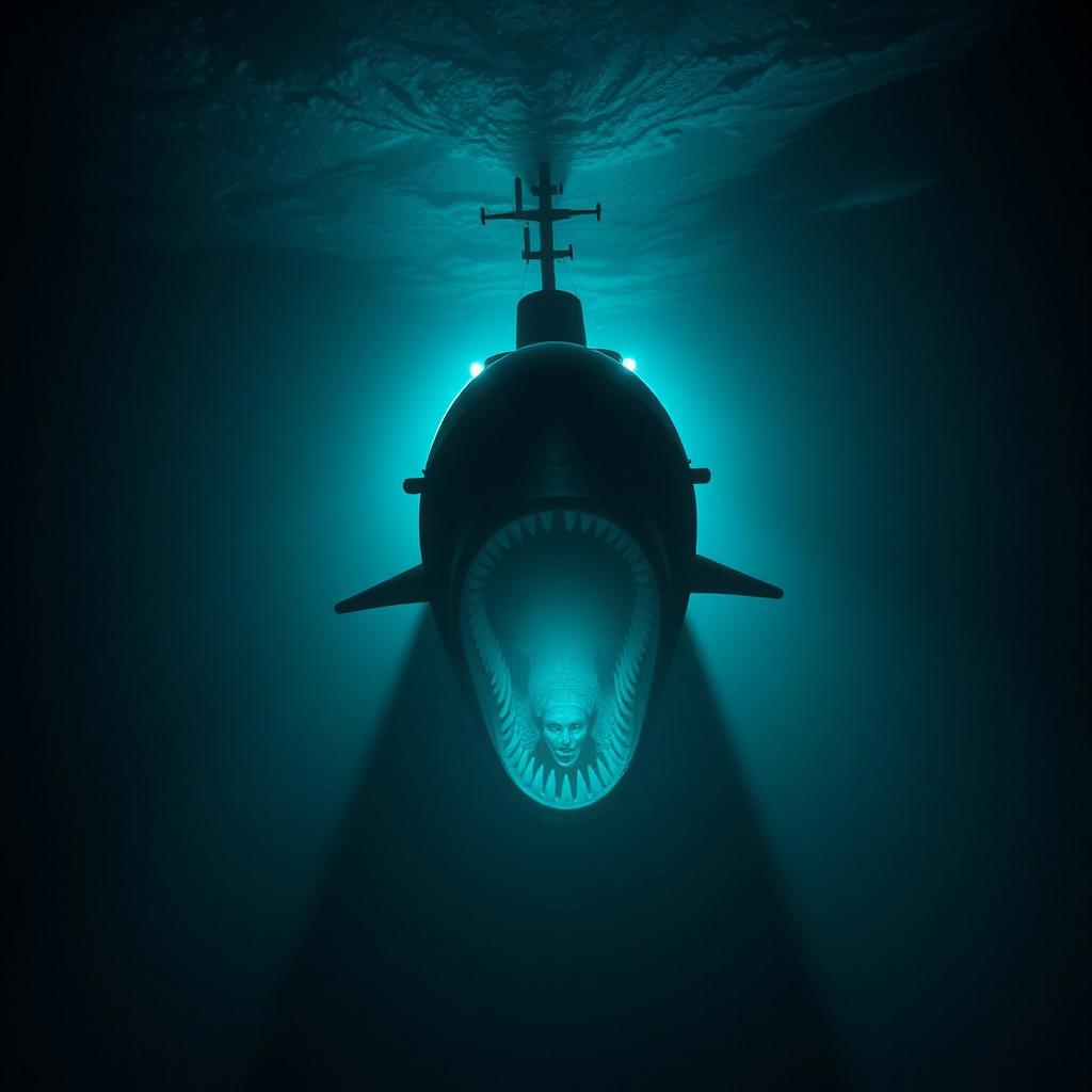 a submarine sailing on the (bottom of the ocean) with the lights pointing forward, the front of the submarine has an abyssal monster with its mouth open ready to swallow it, it is not possible to estimate its size, but the monster makes the submarine seem insignificant, megalophobia, thalassophobia,