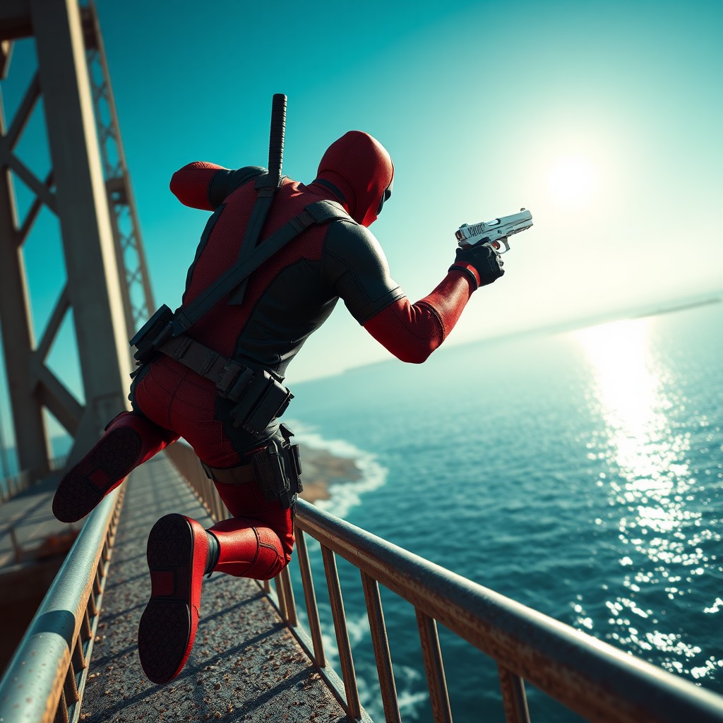 Deadpool is jumping from a bridge in a sea, red third person oponion, super focus on male, superrealistic, in his right hand he has a gun, , you see his back