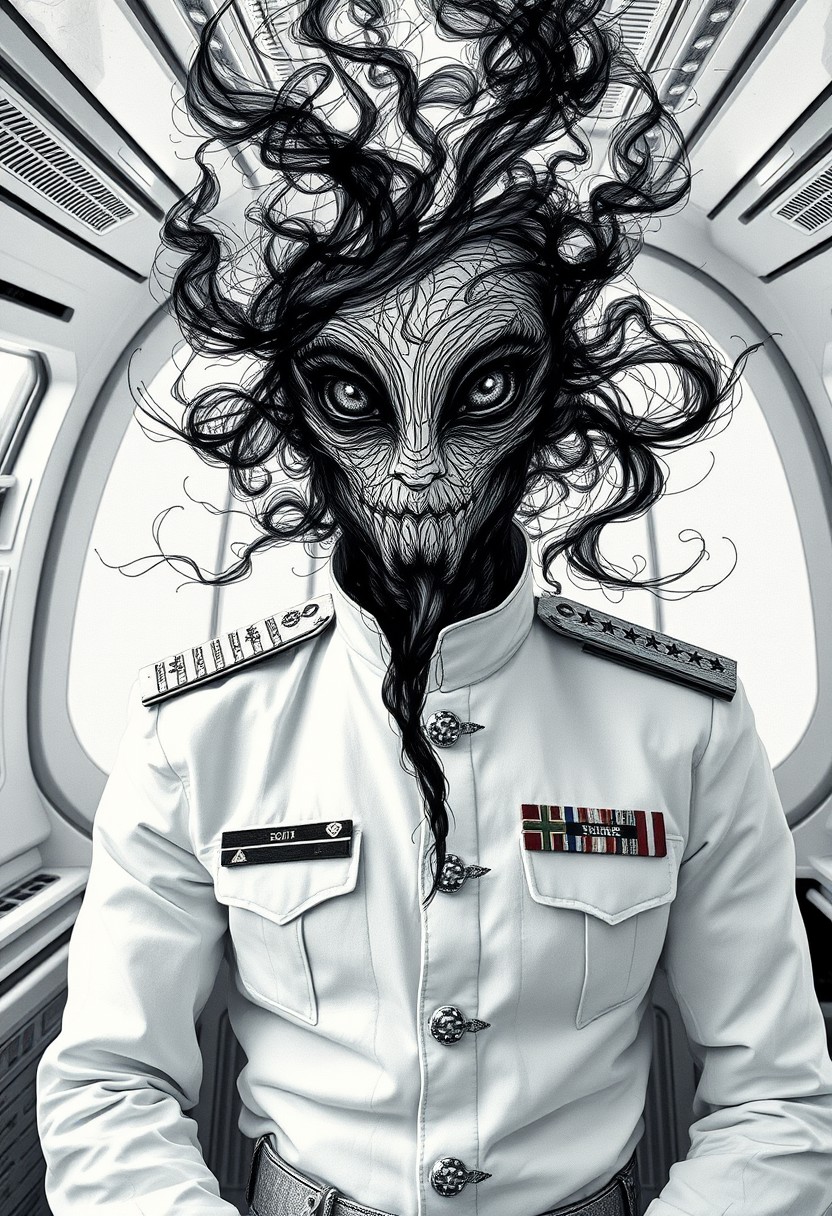 aboard an intergalactic alliance spaceship, we meet the captain, the uniform is white with many decorations from his services during wars. The captain is an alien made of vapor and energy, to us he looks like cloud of black smoke and ink doodle, a human like silhouette made of scribbled crossing black ink lines, lines that pulsate like under an electric current, round where eyes would be, are two levitating gems clouded by the black smoke and lines.