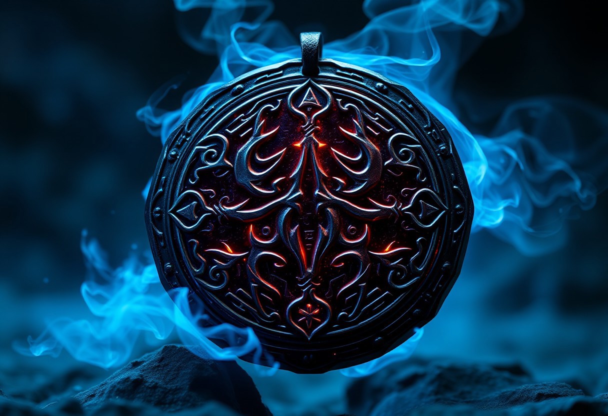 ancient amulet, glowing with dark blue and black energy, intricate sigils carved into obsidian, pulsating with infernal energy, ethereal blue mist swirling around, photorealism, high resolution, ((masterpiece)), suspended in mid-air, glowing demonic symbols floating around the amulet, deep blue and silver hues, dark and mysterious, surrounded by soft shadows, cold and foreboding aura, dark runes etched into the surface, ancient occult artifact, subtle cosmic energy radiating from within, black tendrils of energy reaching out from the edges NEGATIVE: blurry, flat colors, dull, low quality, modern, cartoonish, overly bright, simplistic, futuristic