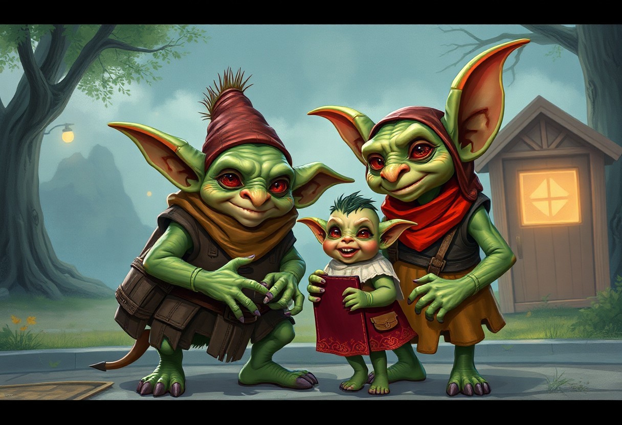 proud goblin dropping their goblin child off at the first day of preschool, imaginary slice-of-life, fantasy art, ultra-detailed, high resolution, emphasizing facial expressions, visual storytelling technique, quixotic, colorful,