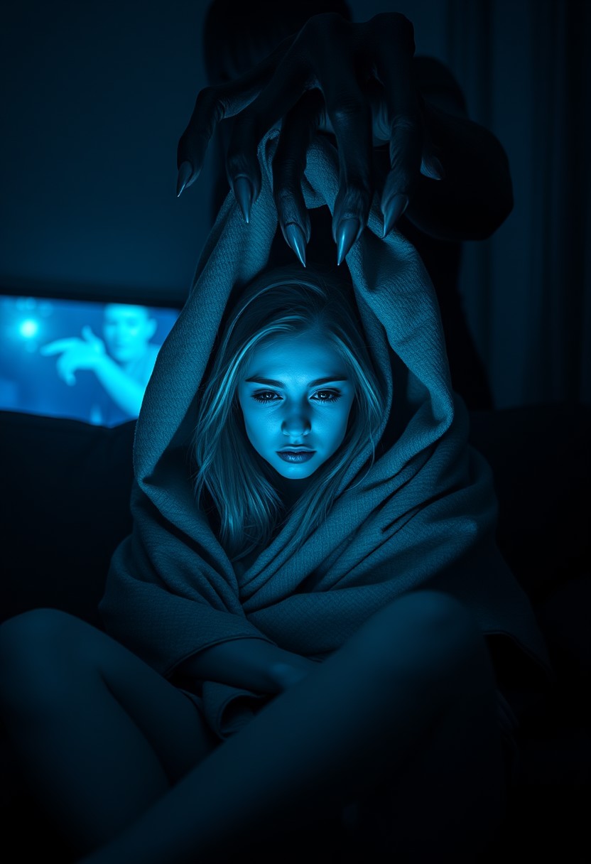 "Create a hyper-realistic image of a young woman sitting on a couch, wrapped in a blanket like a makeshift tent, her eyes fixed on something in front of her with a look of terror. The only light source in the room is the glow from a TV, casting an eerie blue light on the woman's face. Behind the couch, a dark, malevolent entity looms, its presence seeming to fill the room. A twisted, claw-like hand reaches out from the darkness, hovering just above the woman's shoulder, as if ready to snatch her at any moment. The woman's eyes are wide with fear, her face frozen in terror, unable to move or escape the entity's grasp." Octane render, Highest-Quality, 8 k, intricate details, visually stunning, Masterpiece