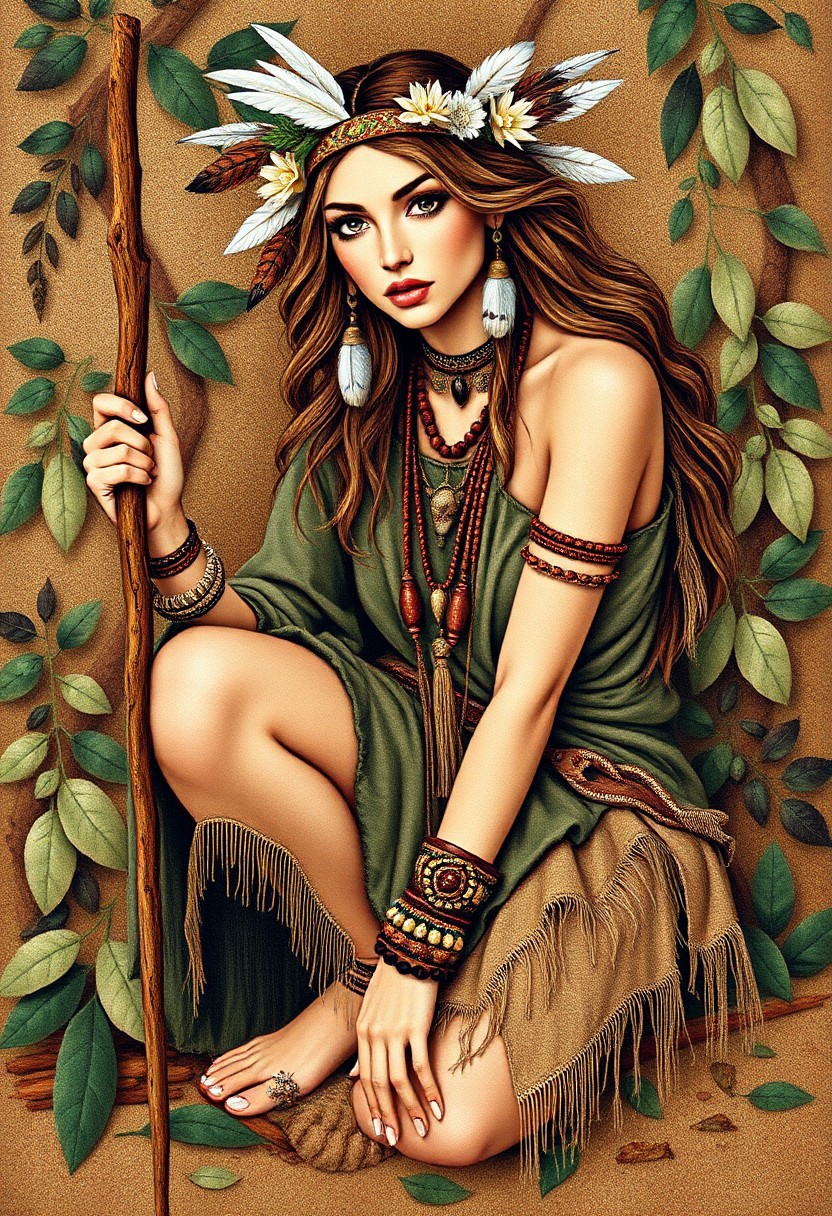 Native American sand painting featuring a woman with a bohemian and tribal aesthetic. She has a slender build, light skin, and long, wavy brown hair adorned with a floral and feather headdress. Her facial features are sharp, with high cheekbones and a focused expression. She is dressed in layered, earth-toned fabrics with various textures, including a mix of greens, browns, and beiges. She wears multiple necklaces, bracelets, and other accessories made of natural materials like beads and feathers. The background is a blend of earthy tones and foliage, giving the image a natural, forest-like setting. The overall composition is dynamic, with the woman in a crouched position, holding a stick, and surrounded by leaves and plants, creating a sense of connection with nature.