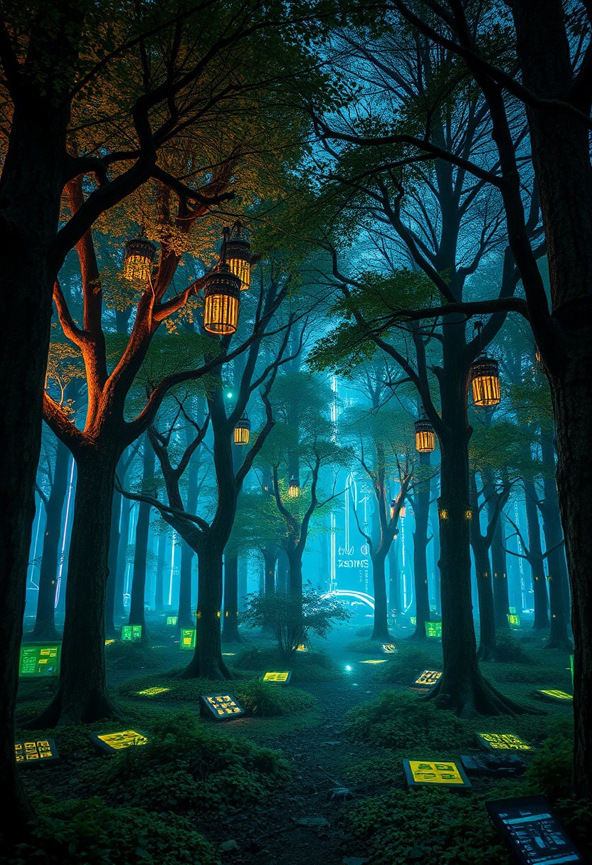A futuristic forest where trees are integrated with glowing technological elements, creating a harmonious fusion of nature and technology