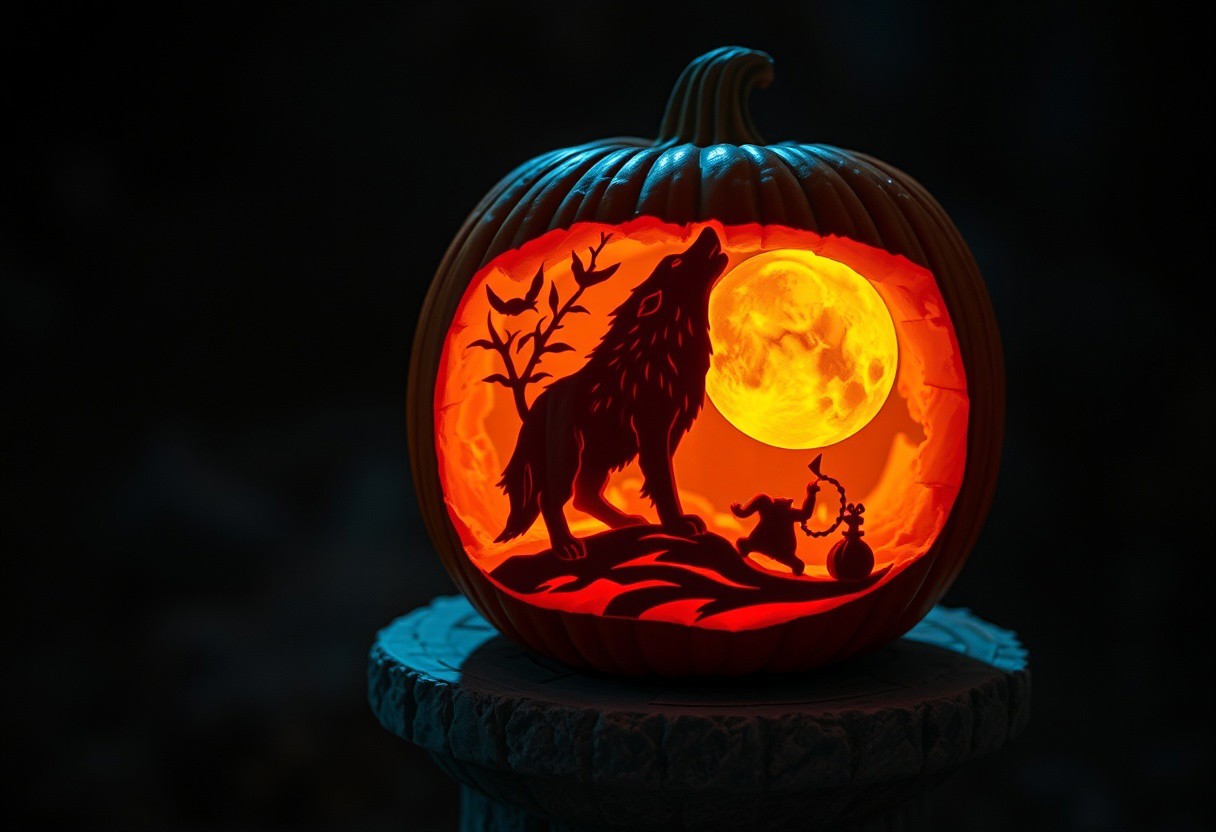 A masterful cinematic photography shot of a beautifully, detailed carved pumpkin, glowing from within on top of an old stone pedestal. The relief like carving on the pumpkin uses different cutting layers into the pumpkin and inlays of gold and cyan to create a beautiful scene that glows from within with bright candle light. The scene carved into the pumpkin is a wolf howling at the full moon. The composition focuses on the pumpkin and the carving, the stone pedestal and the dark, spooky surrounding are only accompanying, out of focus. The colour pallet uses three colours dominantly rich orange tones, deep bright cyan and bright gold. The overall setting is mysterious, dark and spooky. The light setup masterfully catches the glow from within the pumpkin and enough light from outside to display the detailed carving on the pumpkin.