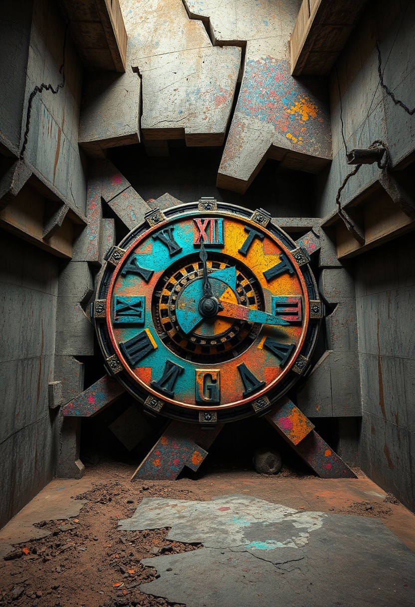 colorful, bright, vivid, fractured geometry in the bunker walls, raw, (polished:-1.3),clock, (smooth surfaces:-1.4), infinite geometry in mechanical structures, soft yet angular forms, (noisy:-1.1), (blurry:-1.2), sculptural appearance, dystopian vibe, fragmented beams, photorealism, weathered textures, rigid platonic structure, (disjointed anatomy:-1.3), (low quality:-1.2), intersecting planes of concrete and metal, brutalist geometry, unsettling, exaggerated platonic forms, vibrant oil pastel colors, multichromatic oxides, recursive shapes in clock gears, (ugly:-1.3), saturated hues of corroded metal, interlocking geometric patterns, primal aesthetic, weathered concrete walls, flowing yet sharp brutal edges, (cartoonish:-1.1), underground bunker, deep earthy tones, high resolution, stark industrial lighting, surfaces, colorful oxides, patina, (overly ornate:-1.5), (bad composition:-1.3)