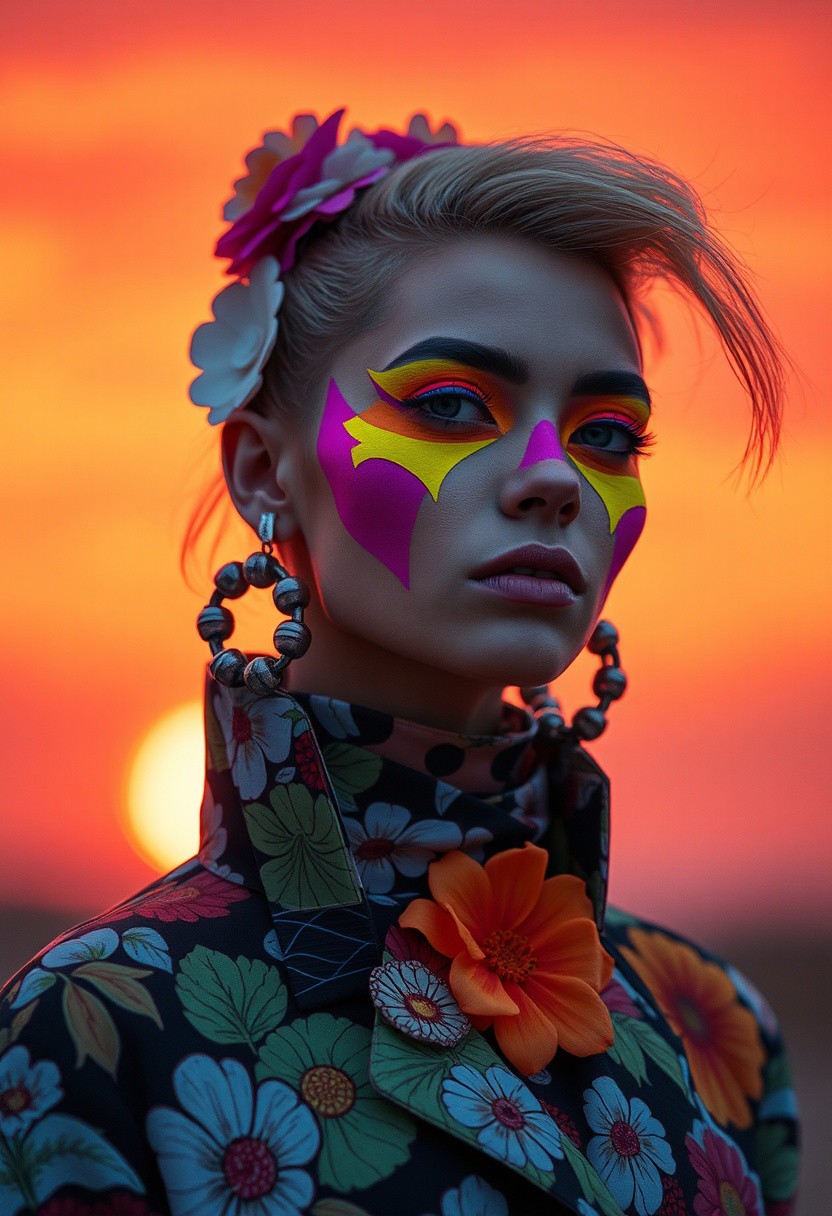 avant-garde fashion model, abstract floral patterns, bold geometric shapes, vibrant neon makeup, experimental fabrics, surreal colors, futuristic accessories, (high fashion:1.4), sunset background, artistic streetwear, exaggerated proportions, dramatic lighting, eclectic jewelry, (conceptual fashion:1.5), avant-garde hairstyle, unconventional textures, mixed media, artistic expression, (8k ultra-detailed), bold contrast, contemporary, futuristic, cutting edge