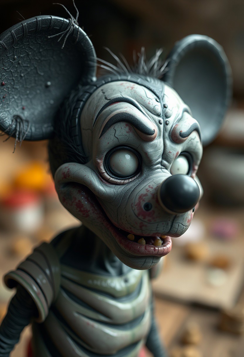 Mickey Mouse as a real life charater, he is a zombie, hyper realistic, ultra detailed skin surface, ultra detailed hair
