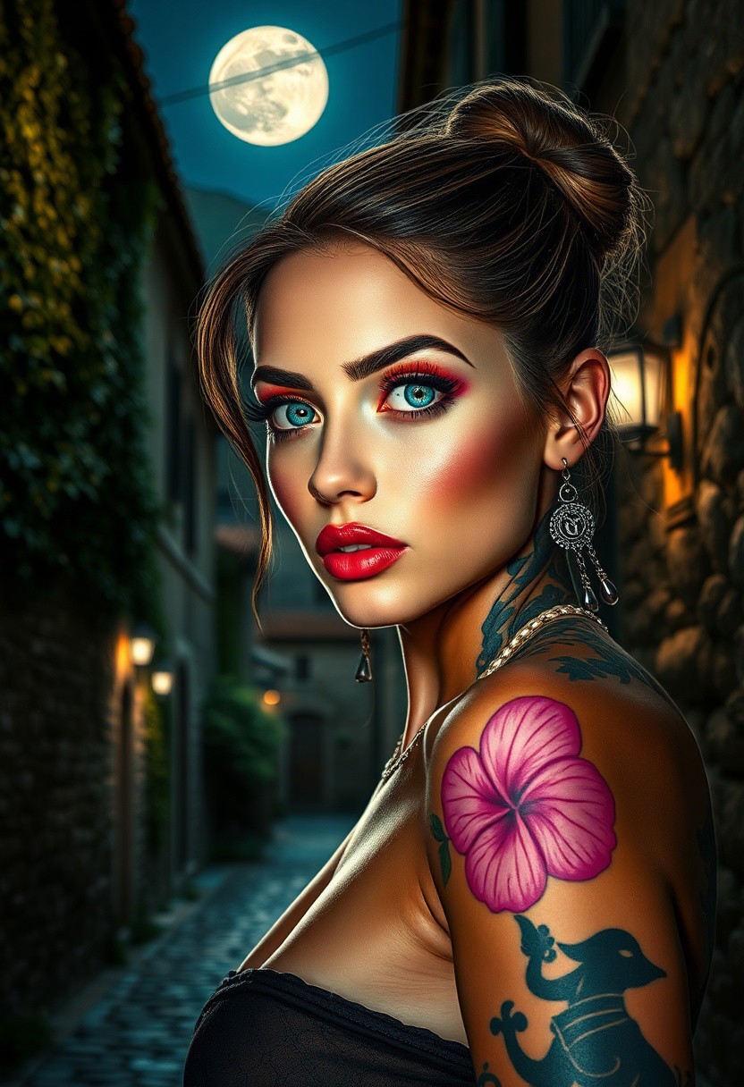 Hyperrealism, extreme close-up Portrait of a beautiful, stunning unique female character. She stands on a narrow cobblestone street in an old Italian village, bathed in the soft, silvery light of the full moon. Terracotta rooftops and ivy-clad stone walls surround her, now cloaked in deep shadows, while the moonlight highlights her large turquoise eyes, filled with joy and excitement. Extravagant eyelashes cast delicate shadows on her face as she gazes to the side. Her pink hibiscus tattoo and vibrant tattoos seem to glow faintly under the moonlight, standing out against her sun-kissed skin. Her gleaming lips shimmer with a soft, ethereal glow. The quiet night carries the distant sound of rustling leaves and the scent of the Mediterranean air. Exuding confidence and serenity, she is a striking contrast between punk edge and the timeless elegance of the Italian night, with the silhouette of ancient stone houses and a sliver of the moonlit Tuscan hills in the background