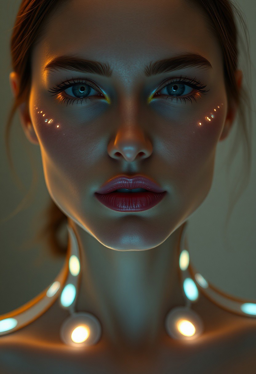 (subtle integrated LED body modification:1.5), (permanent LED makeup:1.6), (soft natural glow beneath the skin:1.7), ((embedded LEDs:1.5)) enhancing cheekbones, jawline, and lips, (gentle projected makeup:1.5), (earthy tones shifting with expressions:1.4), ((flawless radiant skin:1.8)), (futuristic elegance:1.4), ((warm LED glow enhancing facial features:1.7)), seamless, natural-looking tech-infused beauty, (soft under-skin glow:1.6), (delicate LED accents in natural hues around eyes:1.6), (high-definition:1.5), (perfect anatomy:1.6), (radiant smooth skin:1.7) with soft, warm integrated lighting, (permanent light contours:1.5), soft, neutral color projection, (hyper-realistic textures:1.7) blending LED with natural skin tones, refined facial definition, (glowing accents subtly enhancing natural beauty:1.7), (high-resolution:1.5), advanced tech enhancing timeless beauty, (soft natural glow as makeup:1.7), (refined, earthy color transitions), radiant yet understated