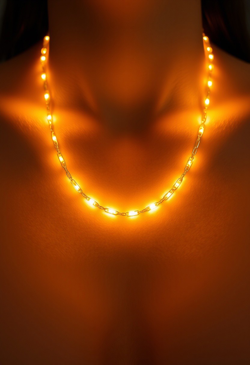 subdermal LED chain necklace, (internal LED glow:1.7) forming a simple, elegant light pattern beneath the skin, (embedded LEDs:1.7) mimicking a delicate chain design, soft golden light radiating smoothly from the collarbone, (subtle chain-like glow:1.6), (classic chain jewelry pattern beneath skin:1.5), natural skin tone with soft, smooth light transitions, high-definition, (ultra-realistic skin textures:1.7), (seamless LED integration into skin:1.6), glowing chain forming an elegant necklace shape, perfect for both casual and formal settings, (worn necklace:-1.8), (visible jewelry:-1.8), (rigid design:-1.6), radiant light flowing naturally beneath the skin, timeless yet modern elegance, minimal appearance