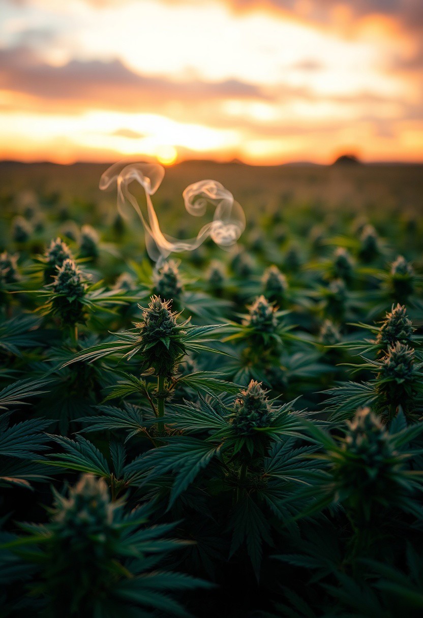 vibrant cannabis field, (lush green leaves:1.4), (sunset glow:1.2) casting warm light over the plants, (detailed textures:1.5), smoke swirling softly in the air, (cannabis buds:1.3) glistening with trichomes, peaceful and serene atmosphere, (natural light:1.4), wide field stretching into the distance, (colorful sky:1.2) with shades of pink and orange, (high-definition:1.6), (ultra-realistic textures:1.5), close-up details of cannabis plants, (soft focus in the background:1.2), modern, laid-back aesthetic, perfect for a cannabis culture feature, chill and relaxed vibe, (overexposed:-1.4), (unnatural colors:-1.5), (blurry:-1.6), (low-resolution:-1.7), (harsh lighting:-1.5), (distorted textures:-1.6)
