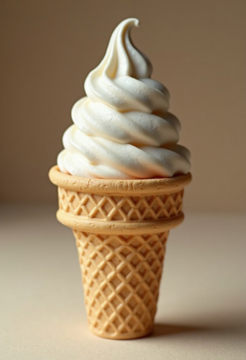 A finely sculpted ice cream cone with (realistic, smooth swirls of soft-serve vanilla ice cream), atop a highly detailed (waffle cone) base. The cone’s (crisp, grid-like texture) contrasts with the (silky, flawless surface) of the ice cream, creating a rich visual balance. (Subtle shadowing and highlights) on the ice cream emphasize its creamy, soft appearance, while the cone itself has a (warm, golden hue) that is brought to life through (fine, intricate carving). The overall composition showcases a (precisely crafted, hand-carved) aesthetic, where (light reflects delicately) off the curves of the ice cream and the edges of the cone, giving the entire piece a (tactile, inviting quality).