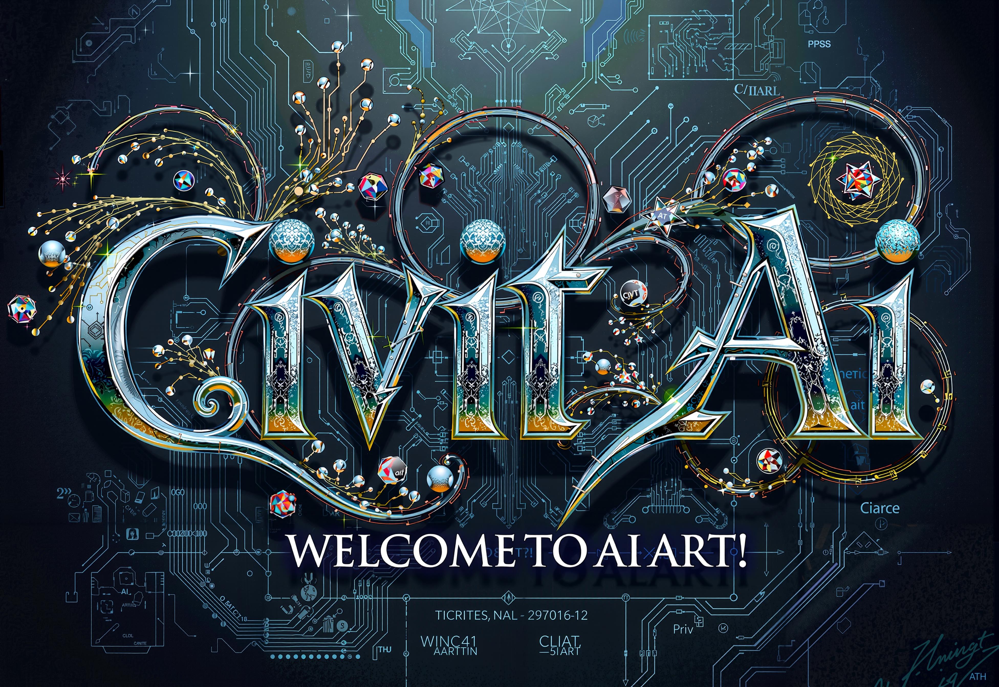 The image features the (text âCivit Ai, WELCOME TO AI ART!â) in a fusion of chrome metallic and Gothic-inspired lettering, set against a complex and harmonious background that blends calligraphy art with technical sketch elements. The chrome letters are bold and reflective, with sharp serifs, sweeping curves, and decorative flourishes. Surrounding the text, the background incorporates elegant calligraphic strokes smoothly intertwined with precise lines, geometric shapes, and detailed annotations reminiscent of technical sketch. Fine flourishes elegantly flow around the letters, integrating seamlessly with microcircuit inspired patterns, creating a sense of artistry. This organic fusion of calligraphy and technical elements extends from the letters, enhancing the reflective metallic surface with subtle, dynamic overlays that connect the text to its environment. The overall composition exudes a balanced, cohesive aesthetic that merges the elegance of traditional craftsmanship with the precision of modern design, set against a dark, atmospheric gradient that amplifies the visual impact of the lettering and the intertwined artistic elements.