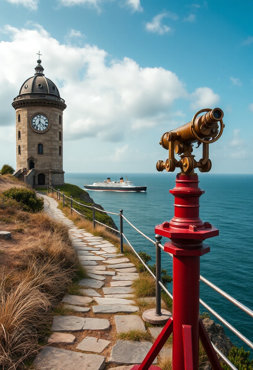 a steampunk influenced image depicts a coastal scene featuring an old stone watchtower with a domed roof, and a magnificent clock, situated on a grassy overgrown path. The watchtower is positioned near the edge of a cliff overlooking a vast, calm ocean under a partly cloudy sky. A steamship cruises past leaving a white wake. In the foreground, there is an intricate telescope mounted on a red stand, with many levers and wheels. It is aimed towards the sea. The path leading to the watchtower is made of irregular stone slabs, bordered by dry grass and a few green bushes. A metal railing runs along the cliff edge, providing a barrier between the path and the drop to the ocean below.