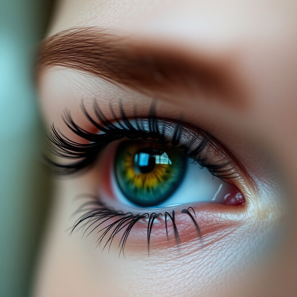 Ultra closeup of a young womans eye, green eye, view from side, mascara, winged eyeliner, mesmerizing, eyelash extension, shallow depth of field, f/1.4, focus blur, beautiful, bokeh, reflections, ultra realistic