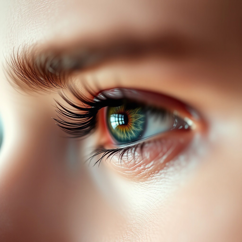 Ultra closeup of a young womans eye, green eye, view from side, mascara, winged eyeliner, mesmerizing, eyelash extension, shallow depth of field, f/1.4, focus blur, beautiful, bokeh, reflections, ultra realistic