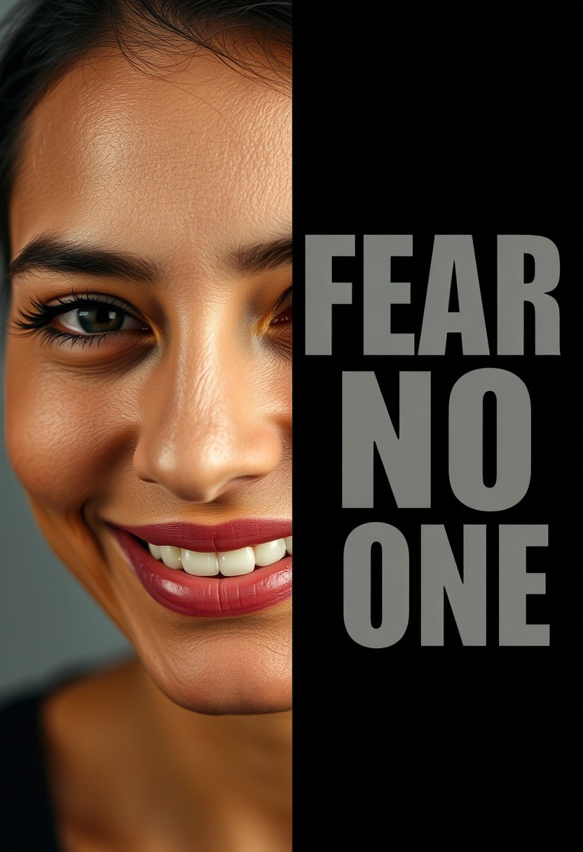 motivational poster with split design, extreme close up portrait of a latina woman in her late 20s looking straight at the viewer smiling with confidence at the camera. The right side is covered with bold text that reads "FEAR NO ONE", the text is cut out of a dark semi-transparent background, the letters reveal the other half of the woman's face