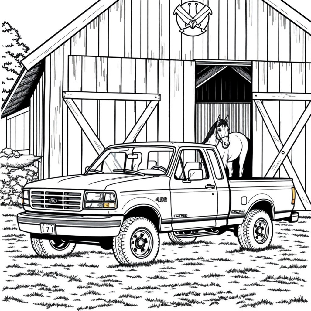 coloring page of a 1997 ford f150 pickup truck parked in front of a large barn with the doors open. a morgan horse can be seen in the barn.