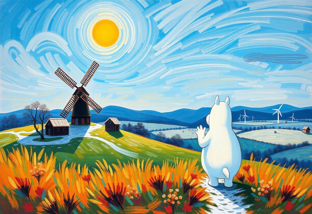 score_9, score_8_up, vivid colors, vibrant colors, Expressive, vivid colors, Moomin:3, Moomintrollen:3, far away, wallpaper, beautiful landscape, masterpiece, sun, Winter:3 looking in the distance:3, backview, looking at landscape, windmill, Classicism:3
