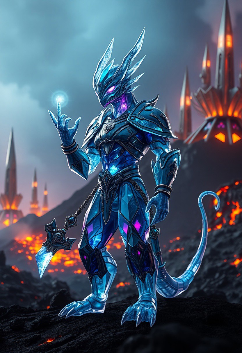 A highly detailed, intelligent portrait of a Krython, a crystalline species from volcanic realms. Standing upright with two hands, two feet, and a tail, the Krython wears ornate fantasy armor, holding an intricately designed weapon that hints at its advanced culture. Its body, made of multifaceted translucent crystals, refracts vibrant colors ranging from deep blues to shimmering purples. Its sharp, sleek limbs and angular features highlight both its intelligence and otherworldly elegance. Glowing eyes radiate internal energy, reflecting its emotions and keen awareness. In the background, futuristic architectural spires of sci-fi design emerge from the volcanic terrain, crafted from crystal and metal, harmonizing with the surrounding geothermal environment. These towering structures pulse with energy, symbolizing the Krython’s sophisticated civilization. The volcanic landscape, with molten lava and rising steam, glows in the eerie light of geothermal vents. The Krython stands confidently, manipulating energy waves with one raised hand, demonstrating its ability to communicate through harmonic vibrations. Cinematic lighting enhances the crystal textures and the vivid colors of the surroundings, emphasizing the majesty, power, and intelligence of the Krythons, guardians of their volcanic realm. (Ultra-realistic, 32k, Masterpiece, High Quality, Detailed Realistic Background, Official Art, Realistic Lighting, sci-fi).