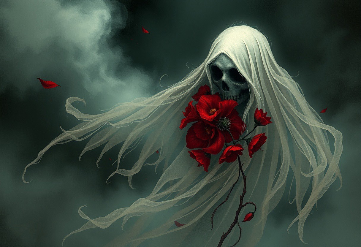 A hauntingly beautiful red floral ghost enveloped in an eerie mist, illustrated in the style of gothic art, intricate details, delicate petals, dark shadows, ethereal atmosphere