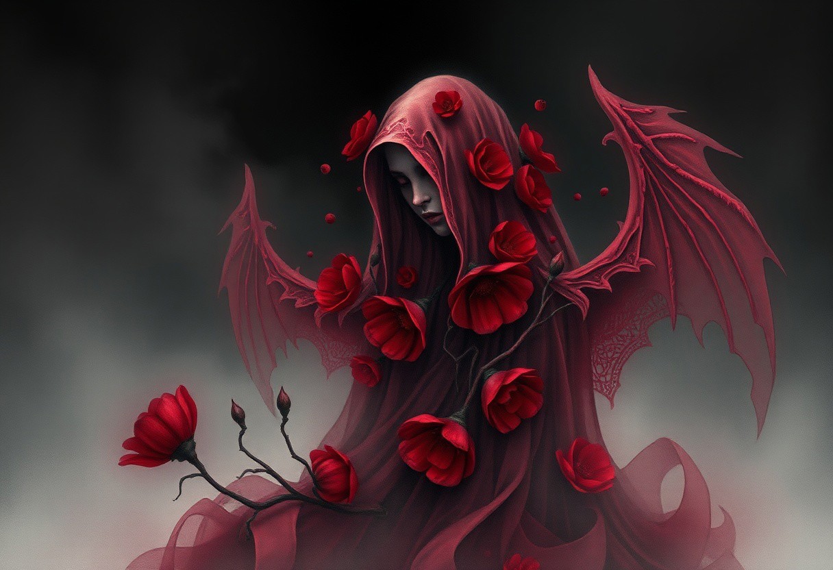 A hauntingly beautiful red floral ghost enveloped in an eerie mist, illustrated in the style of gothic art, intricate details, delicate petals, dark shadows, ethereal atmosphere