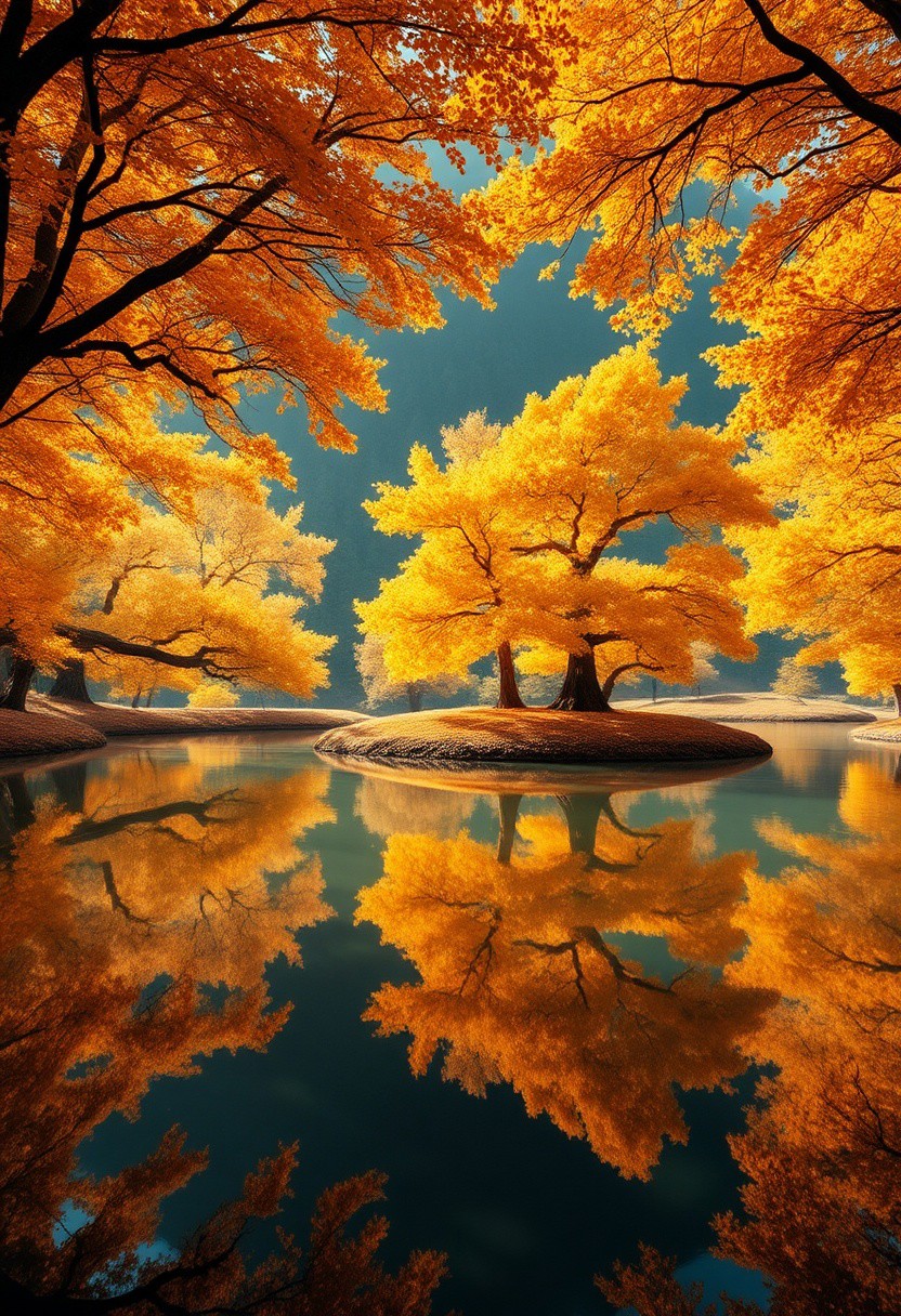 Stunning detail reflection of golden and orange katsura trees around a natural round lake, autumn, realistic, wide shot, art style of Studio Ghibli, magical, whimsical atmosphere, vibrant colors, beautifully lit, serene landscape