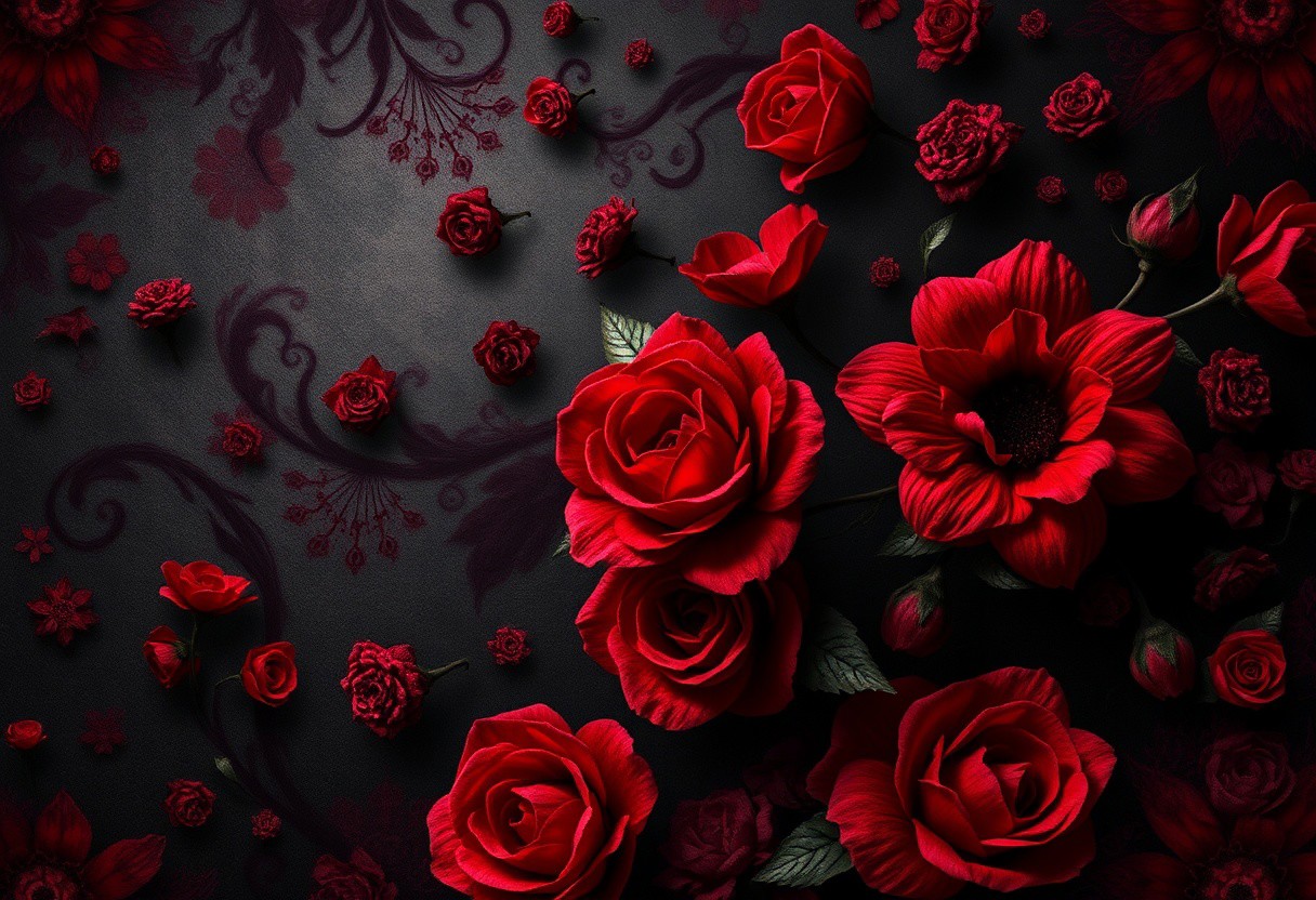 red floral ghostly Halloween spooky wallpaper, intricate patterns, dark gothic elements, high detail, eerie atmosphere, vivid colors, cinematic lighting, digital art, texture-rich, hauntingly beautiful design