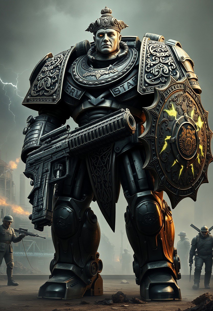 A hulking Armor Warrior, inspired by the might of a Space Marine, strides through a smog-choked industrial dystopia. Clad in a fusion of ornate Victorian armor and an industrial-powered exoskeleton, the warrior exudes a blend of old-world grandeur and brutal efficiency. Towering over common soldiers, its frame is reinforced by riveted iron plates etched with intricate Victorian scrollwork, while mechanical pistons and gears hum beneath, driving its every motion. The warrior’s helmet, a grim fusion of gothic architecture and advanced tech, features a cold, statuelike faceplate with glowing cybernetic eyes. Massive shoulder pauldrons bear the sigil of the Lord of the Storm, while steam hisses from vents on its back, releasing pressure as hydraulic limbs move with precision and power. One gauntleted hand grips an oversized industrial gun with lighting, crackling with arcs of lightning, while the other holds a storm shield adorned with the radiant symbol of a storm god. Cybernetic enhancements reinforce its joints, granting the warrior superhuman strength and endurance. Behind, an industrial city looms—towering smokestacks and crumbling Victorian structures stretch into the stormy sky. Massive iron machines belch smoke as lightning dances among the clouds. The Armor Warrior stands as a sentinel of this dystopian world, embodying the brutal union of flesh, machine, and divine power in a time when technology and the gods are inseparable.
