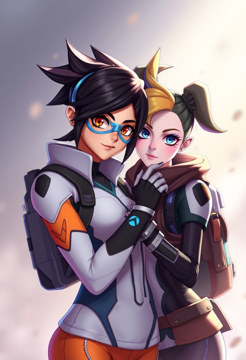 Tracer from Overwatch and Jinx from League of Legends holding each other whilst staring at the viewer