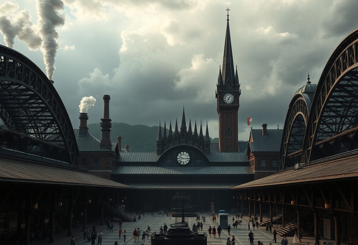 "A sprawling, industrial-era train station dominates the heart of Backlund, its Victorian-age design mixed with steampunk innovations. Towering iron arches rise toward a stormy, dramatic sky, while smoke billows from nearby chimneys. In the distance, the Shrine of the Goddess of the Night stands ominous, its gothic spires veiled in arcane energy. A clock tower looms beside it, casting long shadows over the bustling square. The scene is bathed in soft cinematic light, creating a moody yet ethereal atmosphere. Captured in a full, straight-on shot, the station exudes both grandeur and mystery."