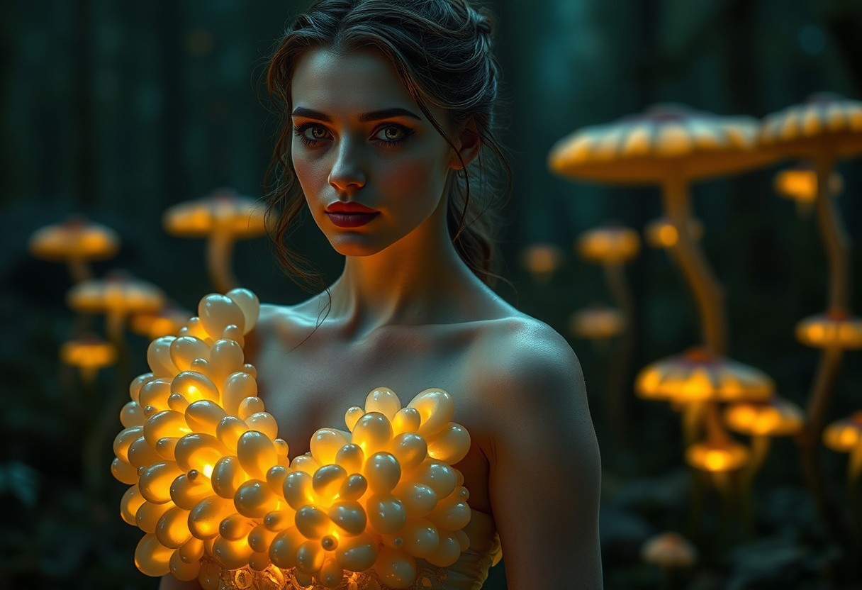 A detailed portrait of a woman in an elegant dress made of luminescent, shell-like structures, blending seamlessly with her soft skin. The scene is set in a dark, enchanted forest with glowing mushrooms in the background. The lighting emphasizes the glossy textures of her gown, creating a mystical atmosphere.