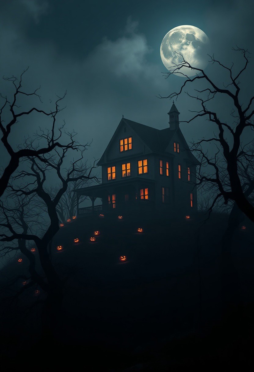 Halloween night, eerie haunted house on a hill, glowing jack-o'-lanterns, dark forest, fog rolling in, unsettling atmosphere, shadowy figureerie Halloween scene, twisted trees, foggy atmosphere, dark silhouettes, haunting shadows, glowing jack-o'-lanterns, fear and nightmare elements, cinematic, high detail, dramatic lighting, inspired by classic horror films, digital painting, 4k resolution, masterpiece.es lurking, fear and nightmare theme, cinematic lighting, high detail, digital painting, inspired by horror artists, 4k resolution, ominous color palette.