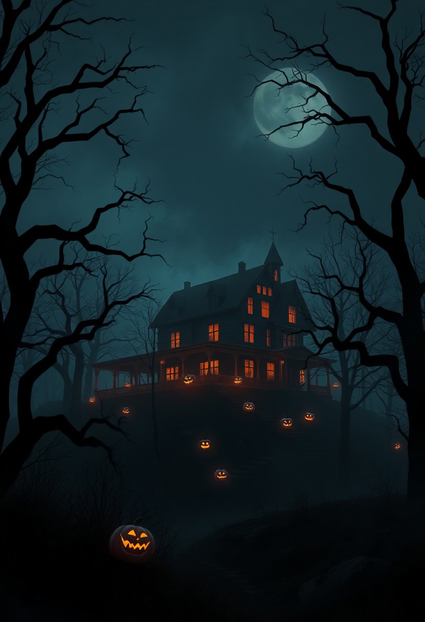 Halloween night, eerie haunted house on a hill, glowing jack-o'-lanterns, dark forest, fog rolling in, unsettling atmosphere, shadowy figureerie Halloween scene, twisted trees, foggy atmosphere, dark silhouettes, haunting shadows, glowing jack-o'-lanterns, fear and nightmare elements, cinematic, high detail, dramatic lighting, inspired by classic horror films, digital painting, 4k resolution, masterpiece.es lurking, fear and nightmare theme, cinematic lighting, high detail, digital painting, inspired by horror artists, 4k resolution, ominous color palette.