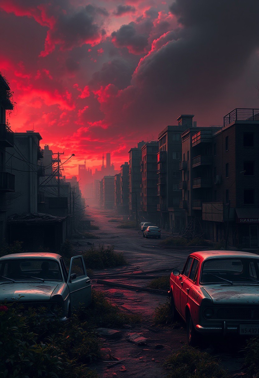 A desolate urban landscape during a zombie apocalypse, overgrown with vegetation, abandoned cars, and crumbling buildings, dramatic lighting with a blood-red sky, high detail, cinematic composition, digital painting, inspired by the works of Simon Stålenhag and Ian Holmer, 8k resolution, hyperrealistic atmosphere, intense survival scene with zombies lurking in the shadows